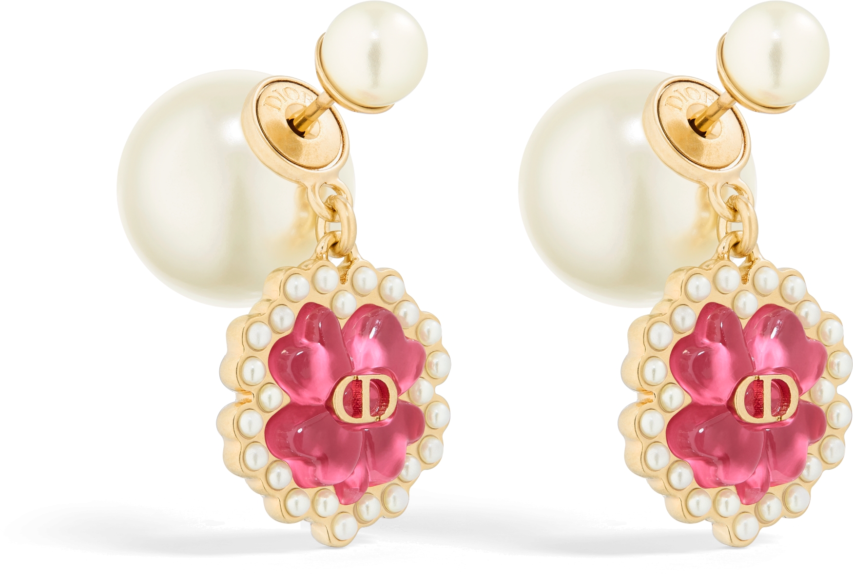 Dior Tribales Earrings Gold Finish Metal with White Resin Pearls and Bright Pink Glass DIOR Very well made.