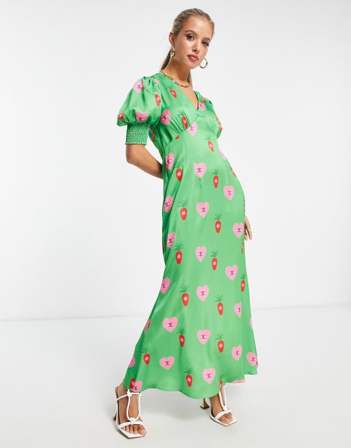 Never Fully Dressed Puff Sleeve Midaxi Dress in Green Heart print Multi Very well made.