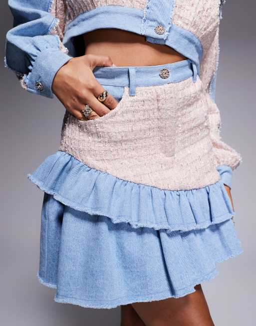 ASOS LUXE boucle mix denim ruffle mini skirt in mid wash blue part of a set Very well made.